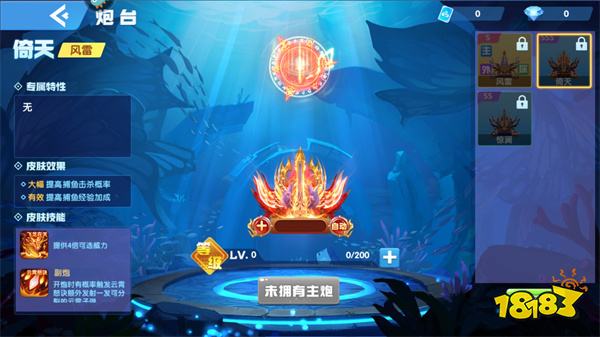 不同的炮台有不同的特性及技能。可在捕鱼房间中,点击“炮台”进入“更换炮台”系统即可预览所有炮台的特殊属性,根据捕鱼场次需求更换炮台。