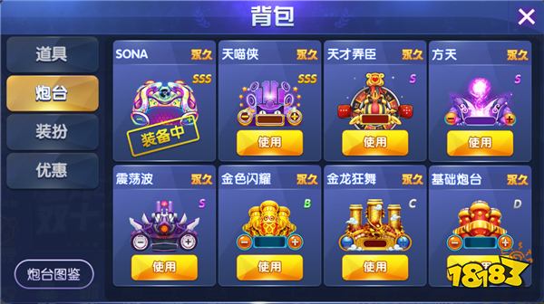 不同的炮台有不同的特性及技能。可在捕鱼房间中,点击“炮台”进入“更换炮台”系统即可预览所有炮台的特殊属性,根据捕鱼场次需求更换炮台。
