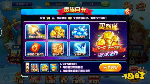 4、升级后或获得大量的钻石,别乱花,全部用来升级炮等级,升级炮还会送金币,没有比这更划算的买卖了。就这样,没一会我们就会升到30倍炮,解锁中级场了。 现在有钱了,可以适当的打打大型鱼、黄金鱼。合理的运用瞄准和冰冻是捕鱼关键,用瞄准后,捕到大鱼的机会要比不用瞄准时高了不止一倍。顺带提一下,如果你是小资玩家,强烈建议购买贵族月卡,这样,每天会白送好多道具和金币。