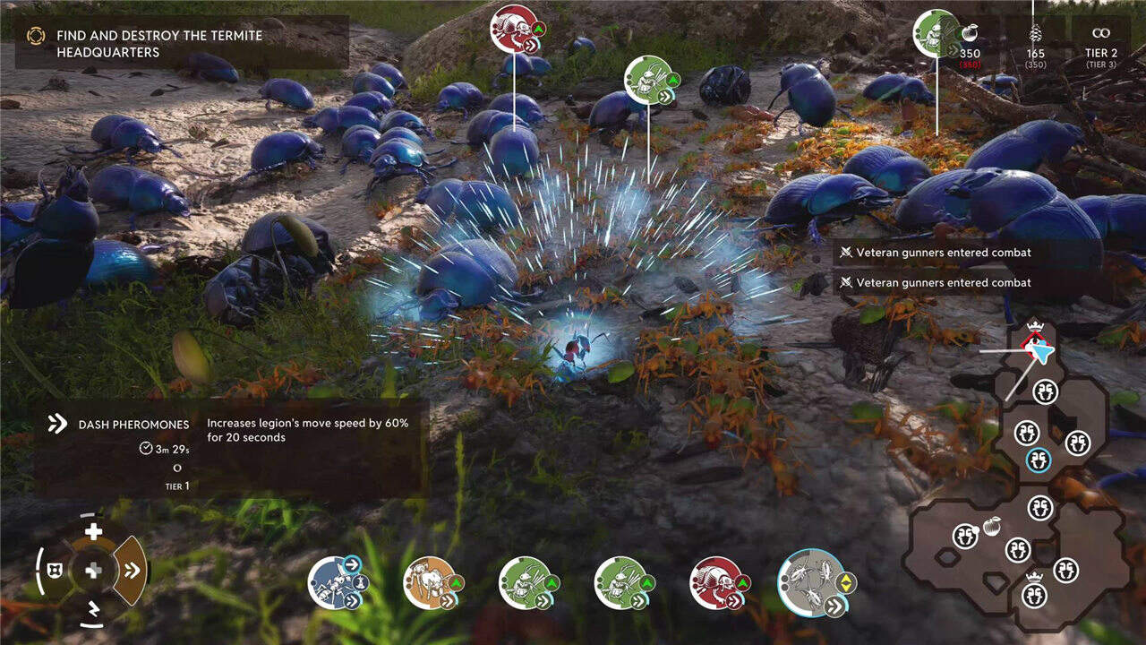 核心玩法是实时资源管理与单位微操。玩家通过标记食物源引导工蚁采集,将养分带回巢穴孵化新蚂蚁。战斗采用即时的碰撞体积和攻击前摇,兵蚁可进行包抄或集火。科技树解锁更高级巢室:兵营可训练精锐战士,信息素塔扩大指挥范围。战役模式包含12个任务,从春季复苏到抵御森林大火,最终面对巨型蚁狮Boss。