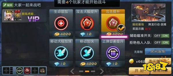 在困难降龙模式开始之前,大家可以在主界面买一些BUFF,主武器弹夹和子弹数量增加的BUFF,可以最大程度的提升玩家在局内的弹药数量。同时也可以使用金币够买攻击提升BUFF和战斗经验BUFF,这样可以提升玩家在游戏中的攻击力。