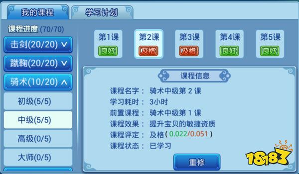 在宝贝学习的过程中,如果宝贝“偷懒”,课程评定可能仅为及格或良好。这时,玩家可以消耗“重修手册”进行重修。如果想要追求极品资质,确保课程评定达到“优秀”是非常关键的。以下是宝贝偷懒时的课程评定图片: