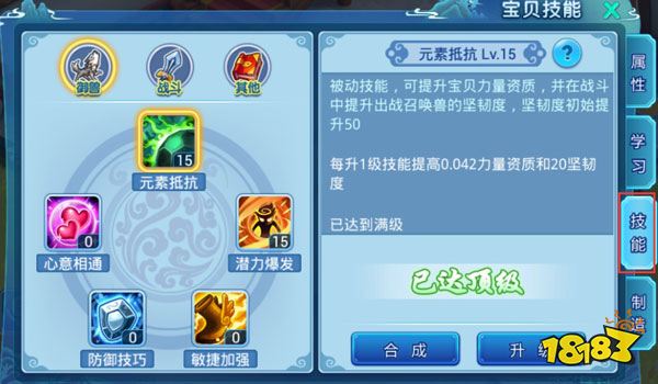 接下来,我们来探讨御兽技能的学习。许多玩家可能会疑惑,为什么课程已经学满,但资质却只达到了总值的一半。这是因为御兽技能是提升资质的最后一环。当宝贝达到60级,也就是少儿期后,就可以开启御兽技能的学习。每项技能都可以额外增加对应的资质,是资质养成的关键步骤。以下是御兽技能学习的相关图片: