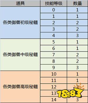 学习御兽技能需要消耗秘籍,技能的最高等级为15级。以下是各类技能所需材料及数量的图片: