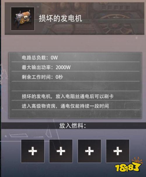 发电机位于刷辐射芯片房的电源处,需要放置电阻丝才能启动,消耗电阻丝获取电能,也可用于家中通电照明。