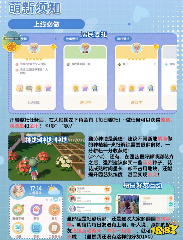 2、上线必做篇:除了坚持完成主线任务和日常任务外,还应该包括每日任务、收菜种地、与好友互动,以及每日刷新的萤石和珍稀木材、限时商店的购买。这些都是建议居民们每天上线时必须完成的事情,否则可能会错失许多材料和重要的图纸、家具装饰奖励等。虽然心动小镇的设计并不复杂,无论是完成任务还是积累财富,更多的是为了休闲和享受,任务清理迅速,大部分时间可以自由地用于建造和装饰。