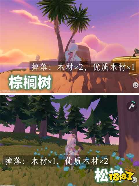 第三种是椰子树,砍伐后会掉落椰子,同样能恢复8点体力。椰子树的树干粗长,颜色偏浅褐色,主要分布在沿海区域。