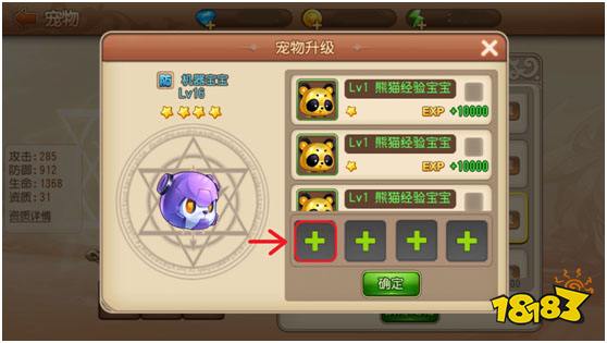 接下来,会显示升级界面。点击加号可以选择添加经验宝宝,以加速宠物的升级过程。