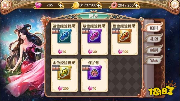 如果玩家遇到道具或材料不足的情况,可以通过点击主界面左侧的【商城】按钮进入商店界面。商店分为道具、礼包、材料、家私四类。玩家需要时常关注商店,因为商店会不定期推出打折或限购活动。限购物品一旦购买完毕,就会从商店列表中消失。