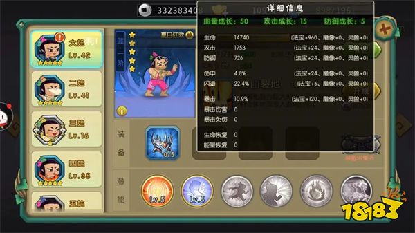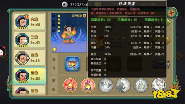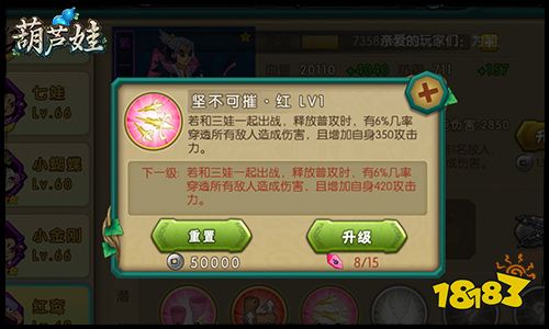 战斗法宝则在战斗中发挥重要作用。镇妖塔是大娃的专属法宝,它不仅能提升大娃的属性,还拥有禁锢所有敌人的特殊技能。八卦镜是二娃的专属法宝,除了提升属性外,还能增加自身能量并降低敌方能量。七星珠作为三娃的专属法宝,除了提升属性外,还具有免疫敌方一次技能伤害的特殊技能。火莲灯是四娃的专属法宝,它能够对敌人造成三次火焰伤害。玉净瓶是五娃的专属法宝,它不仅能提升属性,还能提升团队能量并回复血量。诛仙剑是六娃的专属法宝,它能够对所有敌人造成额外伤害。虚天鼎是七娃的专属法宝,它能够诅咒敌人,降低其50%的防御力。最后,金刚轮是小金刚的专属法宝,它不仅能提升属性,还能使友方前排免疫伤害并增加暴击。