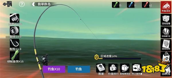 在游戏的钓鱼环节中,玩家需要装备鱼竿、鱼线、鱼钩和鱼饵才能开始钓鱼。值得注意的是,不同种类的鱼饵会影响钓起橙色和红色鱼类的概率。游戏中共有89种不同的鱼类,其中高级品质的橙红色鱼类占36种。玩家在进行5次钓鱼后,将解锁十连钓法,这是一种效率更高的钓鱼技巧。