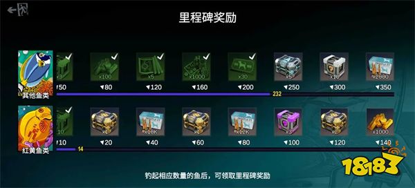 游戏对里程碑奖励规则进行了调整,不再局限于永恒白垩地图,而是所有地图只要玩家进行钓鱼,就能根据钓鱼的数量获得相应档位的奖励。