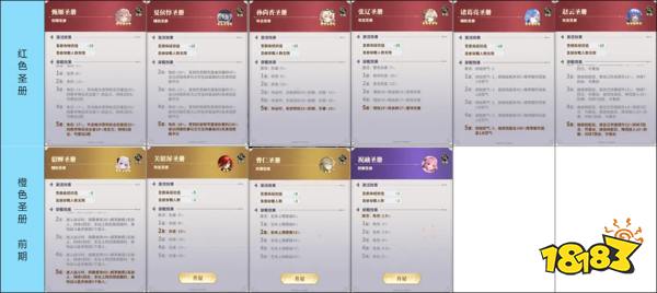 在游戏的早期阶段,红色与橙色圣册的主要目的是作为过渡。夏侯惇和甄姬提供的免伤效果非常实用,而橙色的貂蝉圣册在中期也能持续发挥作用。