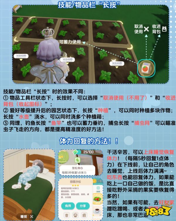 2. 上线必做篇:除了坚持完成主线任务和日常任务外,还应该完成每日任务、收菜种地、与好友互动,以及购买每日刷新的萤石和珍稀木材、限时商店的商品。这些都是建议大家每天上线时一定要做的事情,如果遗漏,可能会错失很多材料和必要的图纸、家具装饰等奖励。尽管心动小镇的设计并不复杂,无论是完成任务还是攒钱,更多的是为了休闲,完成任务的速度很快,大部分时间可以自由地进行建造和搭配。