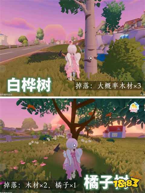 首先介绍的是橘子树。这种树的特点是砍伐后会掉落橘子,树干细长,颜色较深,呈褐色。它们主要分布在家园附近以及大地图上的小镇区域,数量较多。