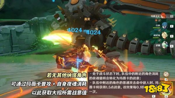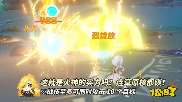 战技的隐藏特性也不容忽视。焚曜之环不会锁定面板,攻击间隔为2秒,每次攻击都能附着火元素,并且最多可以同时攻击10个敌人。如果场上存在草原核,战技还会锁定并造成烈绽放伤害,虽然这种伤害频率不高,但可以作为一种娱乐玩法。