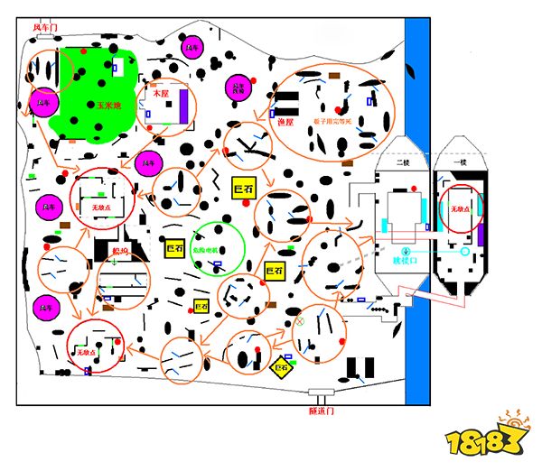 总结: 上图很清晰的标注了密码机和椅子的位置,但是小编要提醒大家,一局游戏会随机刷出7个密码机,位置是不固定的,所以玩家不用死记所有地图的点位,在游戏实战中也不容易记住,特别是那些路痴玩家们。而小编比较建议大家可以先记住图中所有标注“无敌点”的位置,至少在游戏中有对无敌点方位的大概了解,然后以无敌点为地图上的一个焦点,去延深记忆地窖的位置,然后再结合大门位置去记忆,最后可以在开开自定义去跑跑图,记忆起来就容易多了。