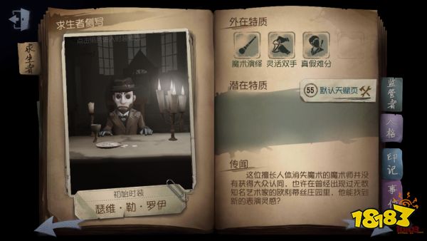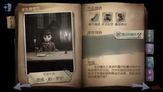比较灵活,翻越障碍加速,同时有着手电筒可以对监管者有一定的干扰作用,同时有着开锁技巧的外在特质(群体增益),当魔术师魔术棒次数耗尽,就能快速得到补充,减少因为开箱的时间浪费。