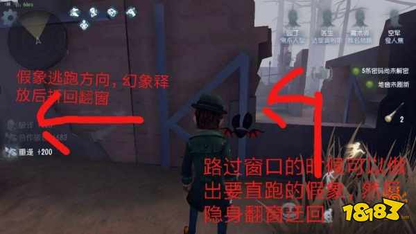 做出要往前跑的样子,然后使用技能隐身回转,翻窗拉开监管者的距离,没有摆脱监管者的话,继续利用废墟的复杂地形和监管者周旋。