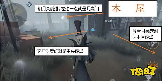 玩家可以依靠天空中的月亮来判断月亮门的方位,月亮门正对着的一条线就是**废墟和工厂,其间有三个板区。月亮门两边都是废墟,左废墟前面是木屋,右废墟前穿过板区就是工厂。从木屋翻窗出去就是**废墟。