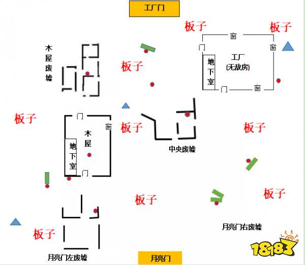 在地图中,最好用来辨别方位的有三个地点:月亮门、木屋以及工厂。对于不熟悉建筑的玩家来说,木屋和工厂可以靠:木屋的两道门是正对着的且窗少,工厂则与之相反。来加以区分。