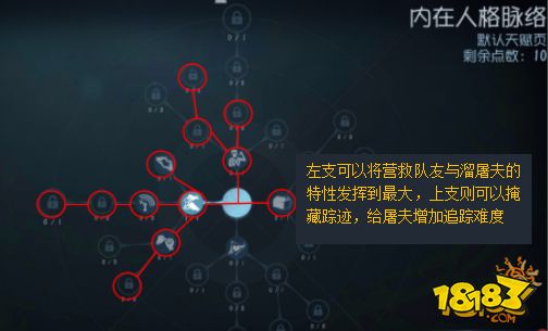 因此左边横着的一条,即【火中取栗】【反面榜样】【膝跳反射】【破窗理论】是必须要点的【绝处逢生】则是给自己增加一条生路。上支天赋的加点能让屠夫更难捕捉踪迹,配合翻越复杂的地形,会让你溜屠夫更加得心应手。【火中取栗】: 从处刑架救人速度加快40%,另外,【强迫症】能让你更容易寻找道具。
