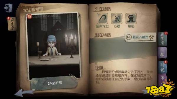 盲女是第五人格中最难操作的一个角色,因为盲女的视野是黑白色的,视距也非常短,几乎就只能看到眼前那么一块小地方。虽然盲女能快速准确的破译密码机,但是她只要被屠夫盯住了,是没有机会逃跑的。羸弱的特征让它在翻板窗的时候速度极慢,而且看不到远处的地图,根本不知道要往哪里跑,可能跑着跑着会发现已经跑进了一个死胡同里了。