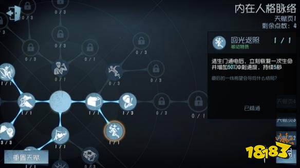 【回光返照】:当密码机均破解完成大门通电时 可治愈自身受伤状态 如果队友都带着这个技能 你们同时受伤 不如赶紧修发电机 这样想去救人或逃跑比互相自摸快