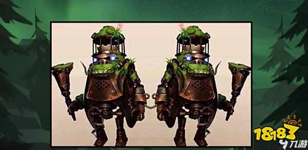 这一款皮肤整体给人感觉有一种荒废机械和荒诞哥特的风格,这套皮肤的邦邦头上长满了绿色的青苔,而金属的躯壳上也全是锈迹斑斑的黄色铁皮,像是被某个人扔到了森林荒废了许久。