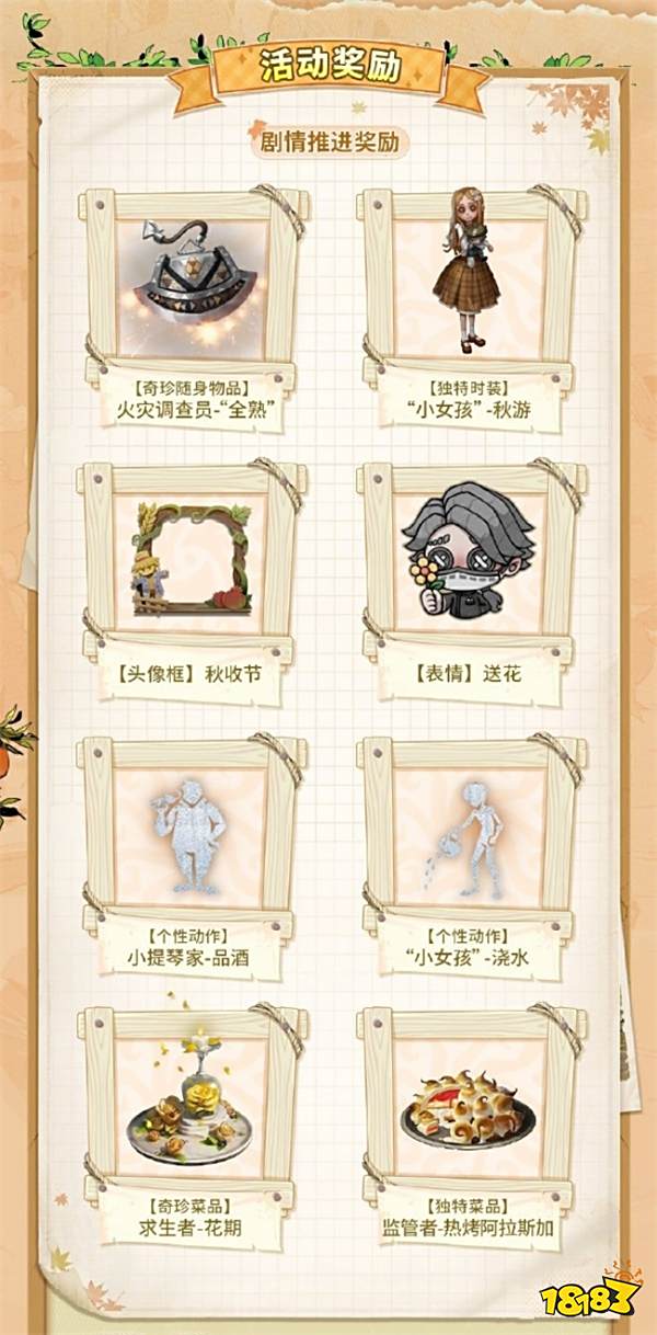 《第五人格》主题活动“田园秋收节”将在9月26日维护后开启,访客们参与活动,完成指定任务,即可获得【奇珍随身物品】火灾调查员-“全熟”、【独特时装】“小女孩”-秋游、【奇珍归宿家具】石榴树盆栽、【独特归宿家具】便携餐盘、头像框、头像、表情、个性动作、归宿音乐、菜品等奖励~