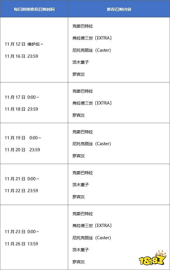 此外,本次活动中的活跃从者「★4(SR) 弗拉德三世〔EXTRA〕」「★4(SR) 尼托克丽丝(Caster)」「★4(SR) 茨木童子」将以每日替换的形式进行推荐召唤!