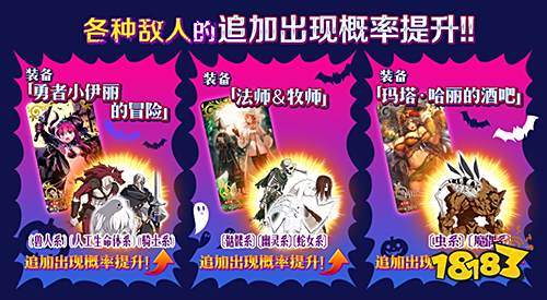 装备商店兑换礼装,【勇者小伊丽的冒险SSR】、【法师&牧师SR】、【玛塔哈丽的酒吧R】。可分别提升活动道具敌人的追加出现概率+25%,满破+100%,且最大为100%。所以建议集齐五张立即满破。