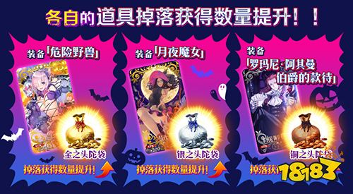 通过装备限时概念礼装【危险野兽SSR】、【月夜魔女SR】、【罗玛尼阿其曼伯爵的款待R】可提升活动道具的掉落获得数量。