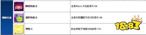 是C阶比较标准的被动。阵地做成进一步提高略优的NP性能,道具做成稳定1技能的命中率。神性提供被特攻的debuff。