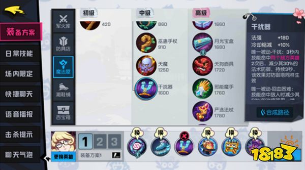 干扰器的法强和冷却缩减可以提升羊丽攻击性,尖刺路障提升存活能力,两件装备的被动对敌方回血、攻速、移速及法防的削减可以更好的协助队友在团战中取胜。