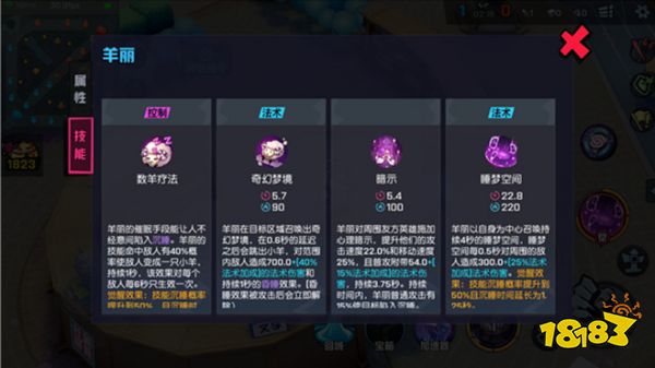 羊丽的催眠手段能让人不经意间陷入沉睡。羊丽的技能命中敌人有40%概率使敌人变成一只小羊,持续1秒,该效果对每个敌人每6秒只生效一次。觉醒效果:技能沉睡概率提升到50%,且沉睡时间延长为1.25秒。