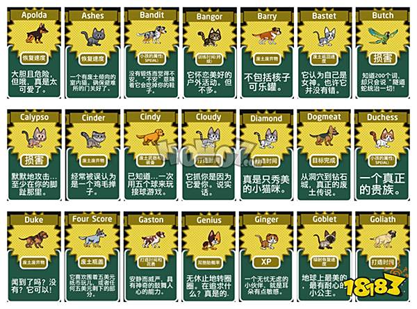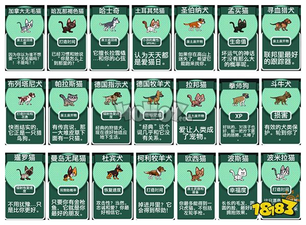 游戏里的猫狗以及鹦鹉都是要派给避难所居民的,有了这些宠物对应居民也会增加不同的效益。在整个游戏中的宠物大概有98只,每种宠物都有相应的品种分类,大概类分别为绿色背景以及金色背景色的品种。