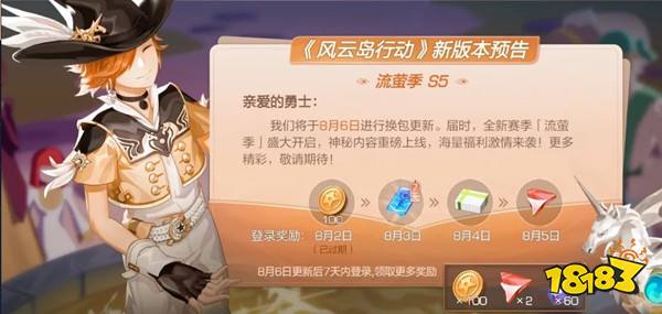 风云岛行动将会在8月6日进行换包更新并开启S5赛季流萤季的版本,而红孩儿将会在8月10日上线!