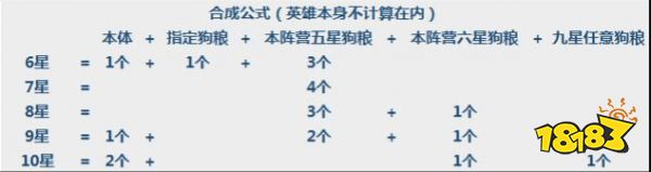 这里还要提醒大家的一点是,培养英雄的时候注意六星和九星这两个结点,这两个位置是可以当做狗粮(提供给其他英雄升星的材料),因此培养英雄的时候考虑清楚,哪些是前期过渡的英雄,哪些是你留着慢慢培养出来的理想英雄。过渡英雄视其强度和喜爱程度可以选择停留在六星和九星作为理想英雄的狗粮。下面给大家提供一张大神做的升星材料表格