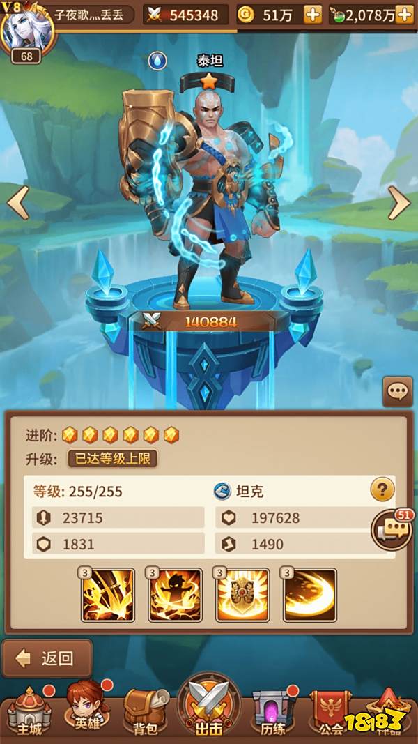 很优秀的坦克选择,有反击,可以给攻击最高的队友提供护盾,分担伤害和驱散(最重要的解控技能),同时非常克制常用英雄中的火系瓦尔基里,因为一技能眩晕首选战士,而同级瓦妹的速度并不如泰坦,因而非常吃亏。