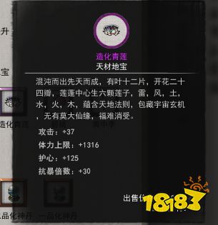 在著名国产RPG游戏《鬼谷八荒》中,造化青莲的作用是能为玩家提供属性。玩家在使用造化青莲后可以获得:攻击+37、体力上限+1316、护心+125、抗暴倍数+30。