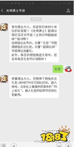 1、首先这个老司机称号我们是需要在微信公众号获取cdk兑换码的,关注光明勇士微信公众号回复“礼包”即可。还有一个方法就是,比如你是在18183下载的,就在18183礼包中心可以领取哦~(文章最后附带cdk礼包哦)