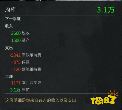 建筑和军队都有维护费用。军队维护费用(包括出征武将和其士兵)往往是大头。部队募集起来后,要么占领新的土地,要么到处掠夺,如果不能形成有效的经济循环,那么部队只会拖慢经济发展。前期可以不急着升级降低建筑维护费用的科技。因为建筑维护费有一个特点:经济性建筑(提高工业商业农业产值)往往是没有维护费的,战略性建筑(生产粮食、军队加成、降低腐败)则有很高的维护费。前期的建筑维护费并不会很高,后期维护费才会提升(然而还是比不上部队维护费)