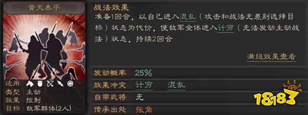 黄天泰平在使用前需要准备一回合,并且自己会进入混乱状态,但是敌人两人会陷入计穷状态持续两回合,混乱状态是攻击和战法会无差别选择目标,而计穷状态是没法用主动战法。黄天泰平可以从张角哪里获得,搭配辅助武将是最好的选择,这个战法的最高发动几率是35%,很低但是效果很好。比较适合的武将有赵云、黄月英、郭准,当然别的武将也能使用,看你怎么搭配了。