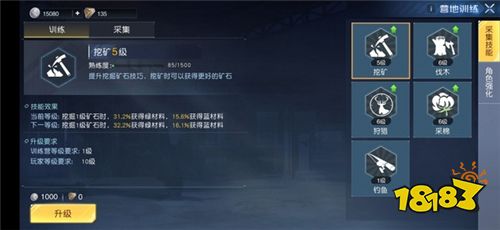 比如训练营解锁,就需要200个木头和100个石头。另外玩家等级,也是影响训练等级的因素,比如下图的挖矿技能,玩家等级必须达到10级,才能花费1000银币升到6级。
