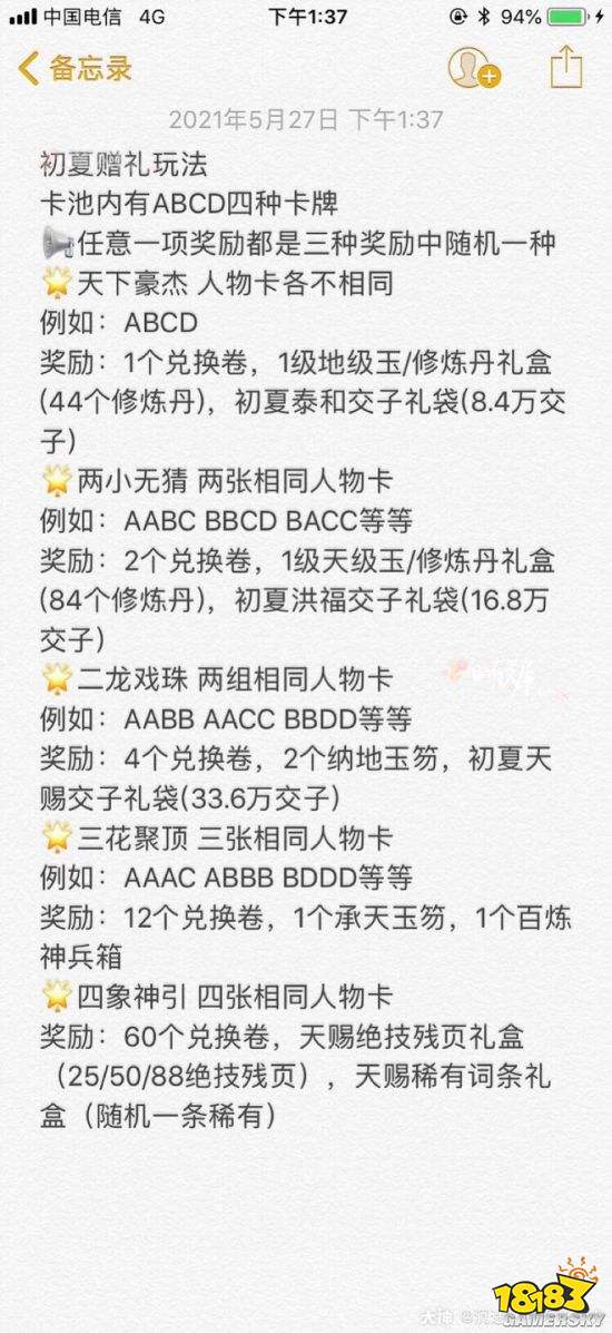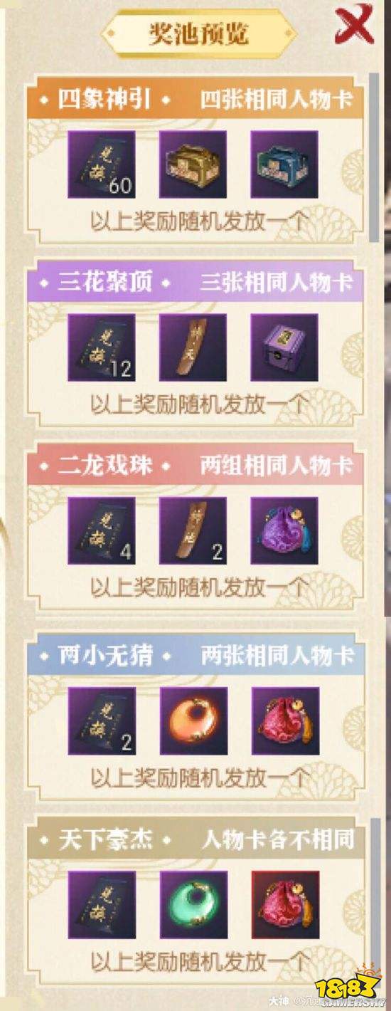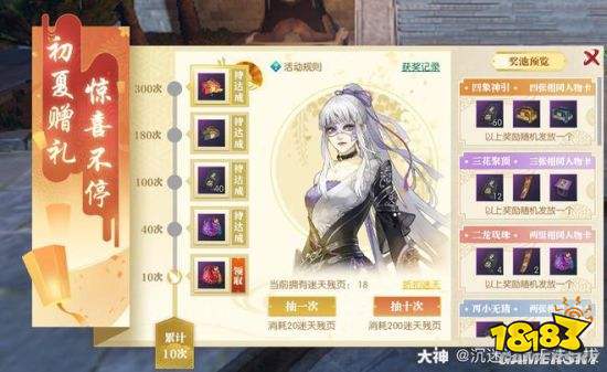 新活动为抽牌活动,抽一次20迷天残页,通过四张牌的卡面决定你获得的奖励