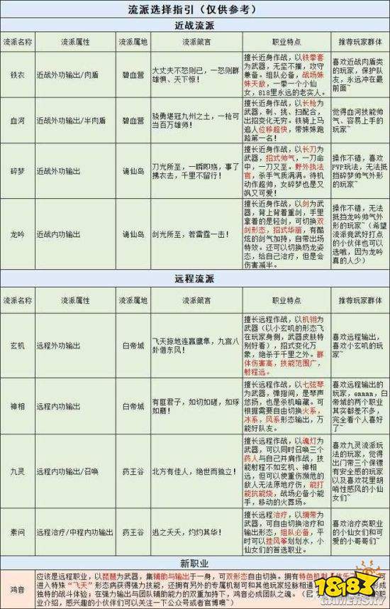 初入江湖,如何选择职业流派呢?为了方便初来乍到的小伙伴们能对目前的江湖流派有一个初步的认识,更好地选择适合自己的职业,我汇总了一下各个流派的基本信息表格,以供参考~