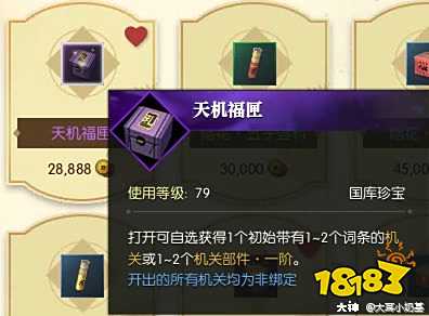 皇宋国库折扣上架【天机福匣】和【天机福匣礼包】,【天机福匣】2.8w铜一个,打开可自选获得1个初始1-2阶(即1-2词条)的机关或1-2个【一阶机关部件】,【天机福匣礼包】28w铜一个,打开可获得10个【天机福匣】。