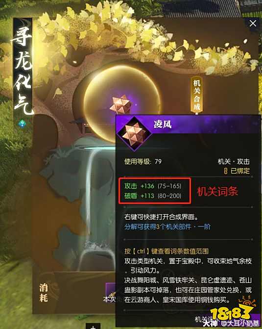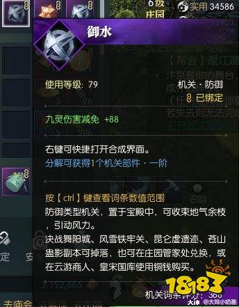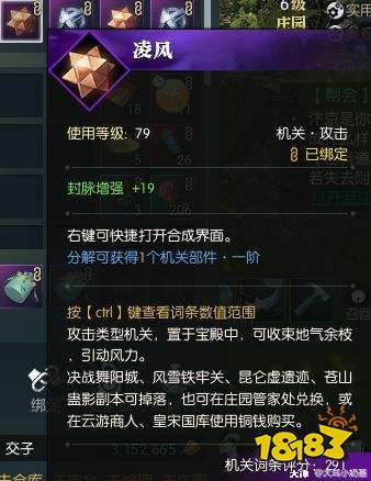 分解机关可获得机关部件,机关部件可用于提升同阶机关的阶数。当前机关最高为6阶,词条数量决定机关为几阶。机关不分内功外功,内功职业只能获得内功词条,外功职业只能获得外功词条。