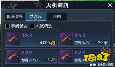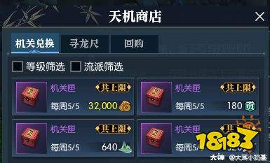交子和威望兑换机关:在庄园【管家】处打开天机商店,可用交子、天江威望、武林威望、帮会贡献兑换机关。每周可兑换5个。